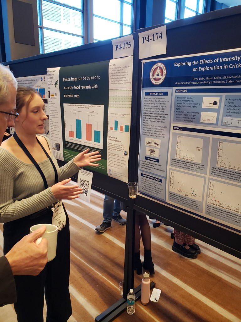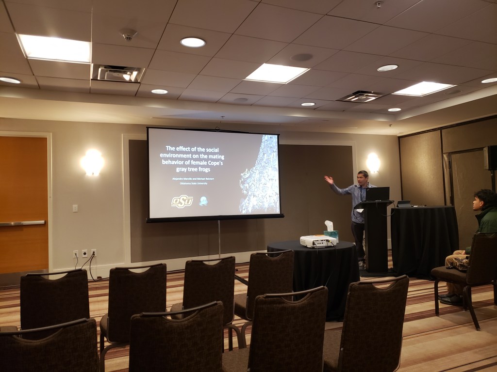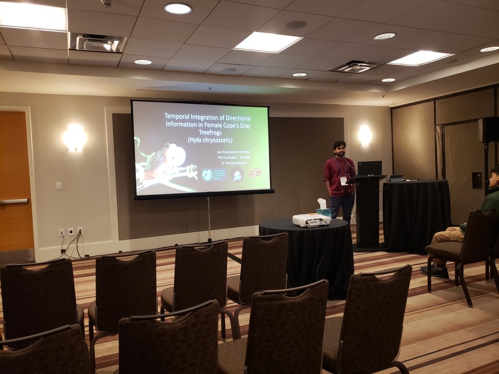 The lab was well represented at SICB. Michael presented MS student Phoebe Will’s work on resting metabolic rate and calling in gray treefrogs. Alejandro Marcillo and Jain PK both gave talks on the fist chapter of their PhD. And lab alum Elena Liebl gave a poster on some of our cricket aggression work. Michael also attended the Animal Behavior Society Conference in Ontario in the summer and presented on our communication network simulation work.